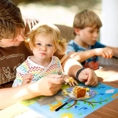 A little sheet of neat! Our Table Topper® is the original, stick-in-place disposable placemat. The Neat Solutions 60ct disposable table topper® acts as a barrier against bacteria and germs and is thoughtfully designed to provide a clean, sanitary eating surface for the little ones while dining out. 4 adhesive strips keep the mat securely in place. Engaging design helps teach children about numbers, counting and item recognition. Each generously sized mat measures 12″ x 18″. Disposable for easy clean-up and the convenient, re-sealable bag is great for travel. Perfect for babies and children 6 months and up. BPA and PVC free.